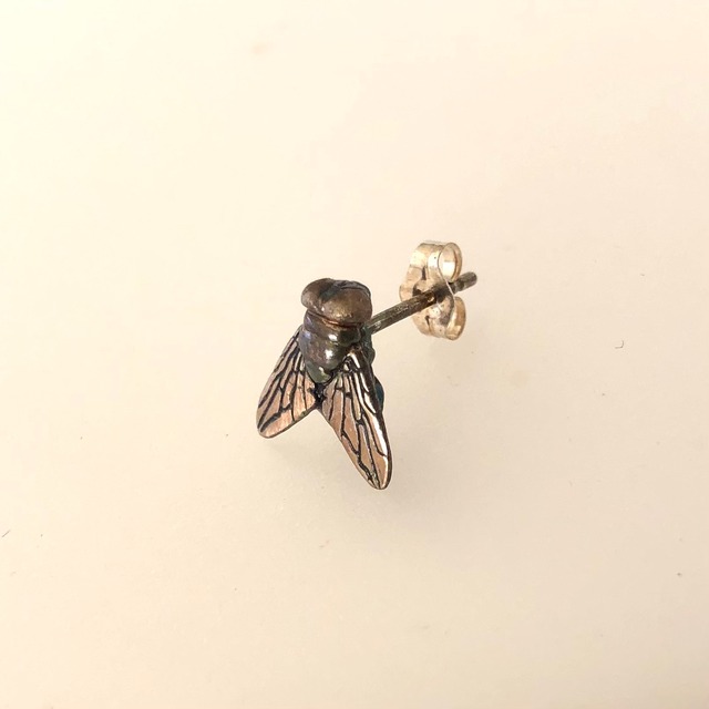 リアルなハエのピアス(片耳用)です。 「キンバエ」をモチーフに制作しました。サイズもリアルサイズ。 もちろん、実物をよく観察し、その形や色の美しさに惚れ込みながら制作しました。 よくよく観察してみるといろいろな発見があるもので・・・ ハエも人間と同じだな・・・と思うのです。 私はハエのバッジを帽子や上着の胸元、バッグに着けてお出かけします。 「それ、ハエ?」「え~!ハエ?」「なんでハエ?」などとよく言われます。 そう、このアイテムは、コミュニケーションツールとしてもお勧めなんです。 そこから会話が始まるのです。 ※一つ一つ手作業で仕上げているため、仕上がりの色味は写真のものと若干異なることがあります。個体差としてご理解ください。 ※耳たぶにピタッとつくスタッドピアス以外にも、耳下でぶらぶらとハエがぶら下がるタイプのものもあります。ぶら下がりタイプをご希望の方は、メッセージにてお知らせください。 ■ 素材:本体、SV925(いぶし仕上げ)