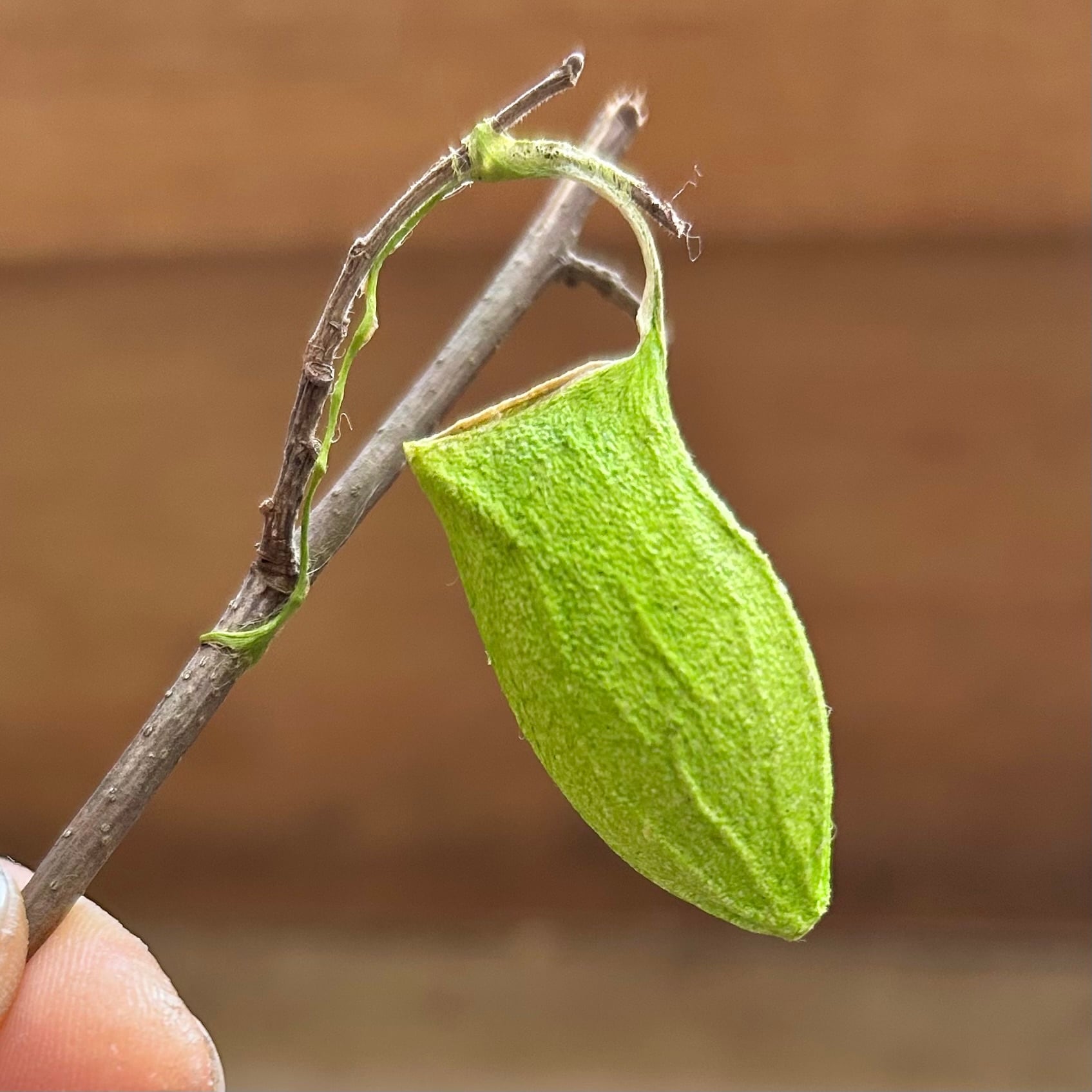 成虫は繭の上部をこじ開けて飛び立っていきますが、カラになった繭は木に残り、冬になると、木に残った枯葉と一緒にぷら~んと垂れ下がっている様子を目にすることができます。