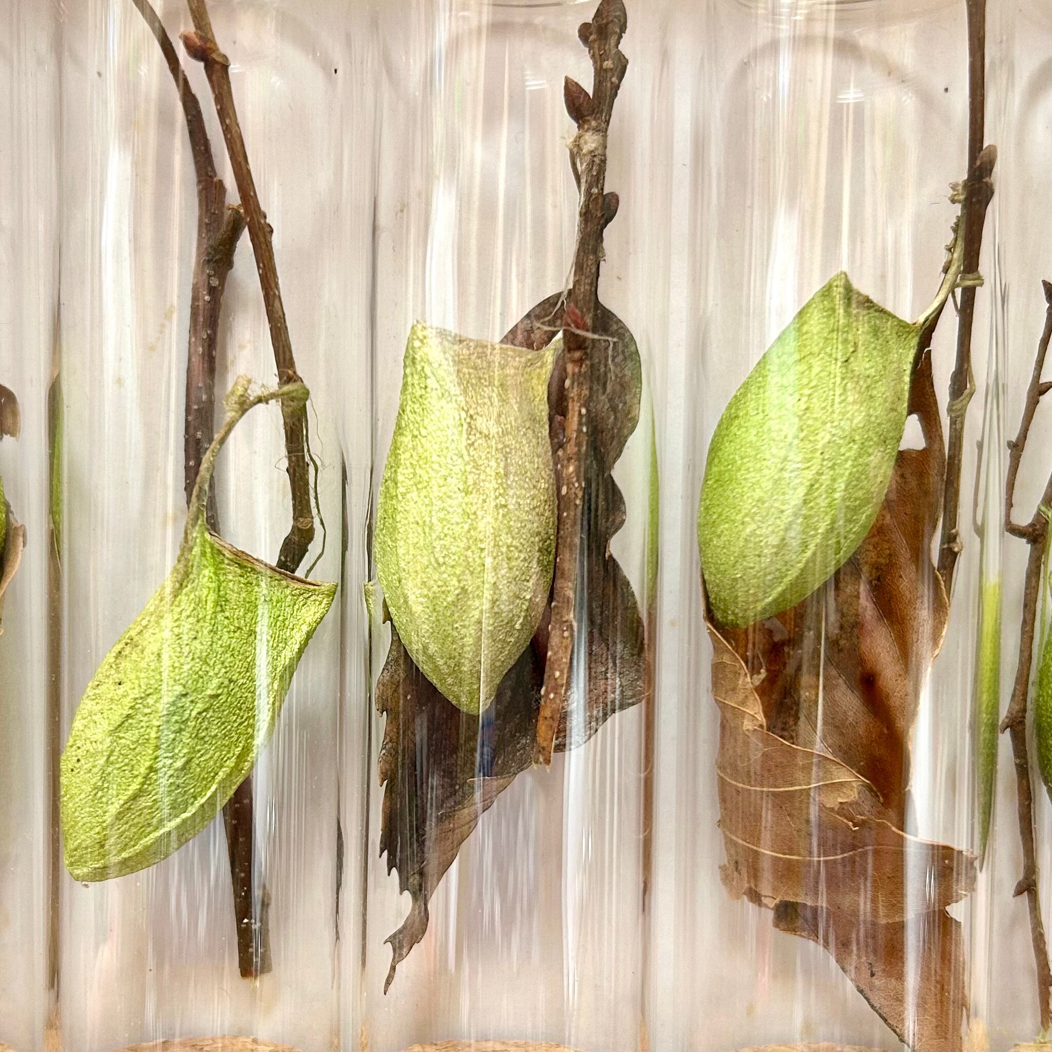 こちらの商品は、私の日常のフィールドワークの中で見つけたウスタビガの繭(抜け殻)を枝ごとビンに入れたものとなっております。